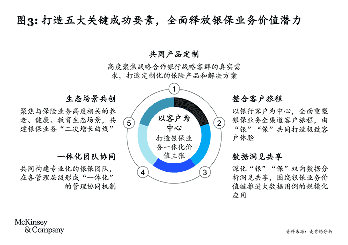 建立中长期稳定的银保合作关系仅仅是万里长征第一步。根据全球领先银保合作的成功经验,我们认为“银、保”双方需要把握五大成功要素,全面升级“银保一体化”价值主张,实现“银行、保险和客户”三方共赢(见图3)。