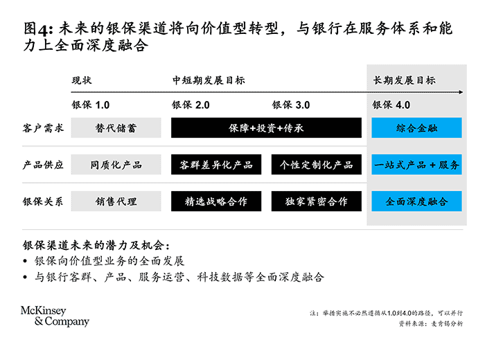 在此基础上,深度融合、内嵌与效率提升将成为银保渠道未来转型的重点。随着互联网科技的普及,银行客户已经习惯在线办理业务,与银行之间的互动也逐渐趋向更集中、更高效的方式。因此,我们认为银保渠道的真正融合,将基于共同定制产品、整合客户旅程、客户洞见与数据共享、一体化团队协同和生态场景共建(见图4)。