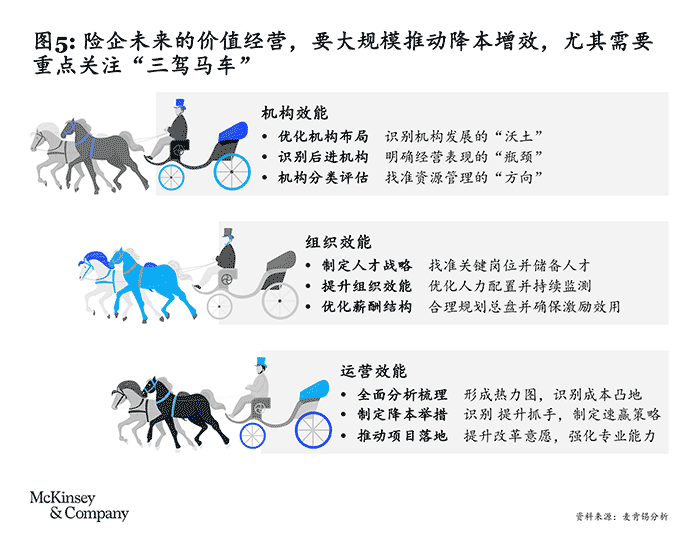 回到当下,在利率下行与投资收益承压的新常态中,险企自身的效能提升将愈加关键。我们认为,提升“机构效能、组织效能、运营效能”是险企降本增效的“三驾马车”(见图5)。机构效能是险企在激烈竞争中的立足根本,组织效能是险企顺利转型的重要保障,而运营效能则是险企成功转型的重要手段。
