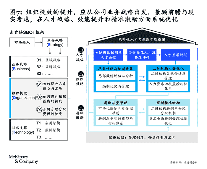 组织效能提升是现代企业发展的重要环节,我们建议险企运用“SBOT”框架,遵循“业务战略与策略–组织提效–技术支持”的路径,快速提升企业自身组织效能,同时重点关注人才战略、组织效能和薪酬激励三大方面(见图7)。