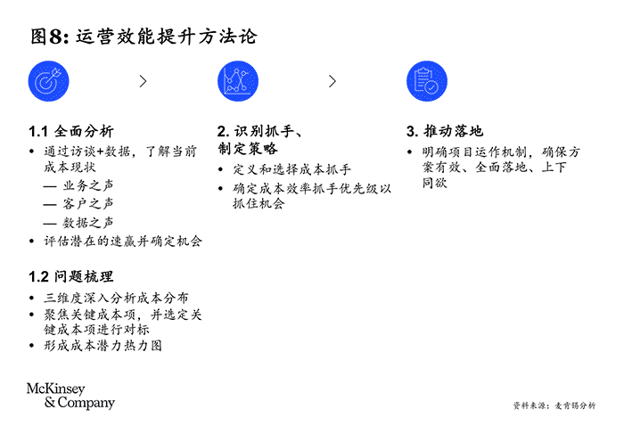 运营效能提升是企业管理中不可或缺的一环,直接影响到企业的成本效益和长期发展,我们建议领先险企遵循“全面分析与问题梳理、识别抓手并制定策略、落地实施”的速赢路径,快速提升企业内部的运营效能(见图8)。