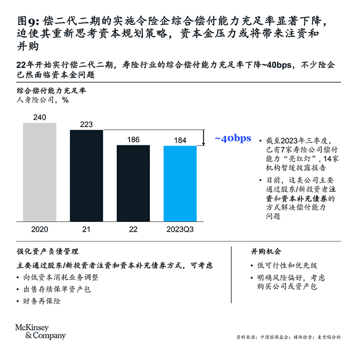 国内保险市场、特别是寿险市场,正面临着偿付能力不断下降的挑战(见图9)。虽然偿二代二期规则对夯实资本质量、优化资本风险计量起到了积极的作用,但也为保险公司资本管理带来较大调整。尤其是在当前利率走低、投资市场波动的环境下,保险公司资本管理的矛盾更加凸显。从2022年初开始实行偿二代二期,到2023年三季度,寿险行业的综合偿付能力充足率下降~40bps(2021-2023第三季度);此外,截至2023年底,共有21家保险机构发债23笔,合计发债规模超过1000亿元,同比增长390%,为历史最高。