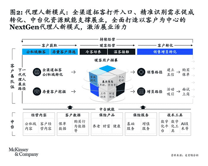 “随着互联网科技和商业模式的不断演进,代理人愈发依赖线上平台和社交媒体来拓展业务,例如将公域流量转化为私域流量后,吸引潜在客户并建立信任关系;同时通过公域流量转化,吸引对保险销售感兴趣的人成为新的代理人。因此,为了支持代理人的工作,寿险公司需要打造一个强大的业务中台,提供完善的内容和工具支持,从管理模式、运营方式、客户数据分析和应用能力等方面,为代理人提供更精准的客户分析和支持,协助其高效展业和转化客户。”
