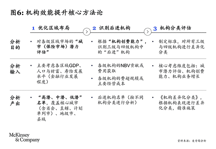 机构效能提升是险企转型成功的关键之一。我们可从区域发展潜力与机构经营表现两大维度来进行思考,并因地制宜。我们建议险企可重点关注以下三个方面(见图6):