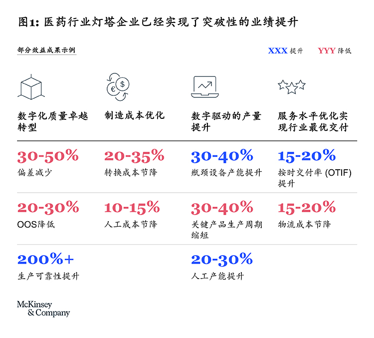 数字化转型对于制药企业来说意义重大。数字化转型的目的就是为了实现价值创造。领先的制药行业灯塔企业已经在产量、成本、质量、效率、能耗等方面实现了显著提升(见图一)。
