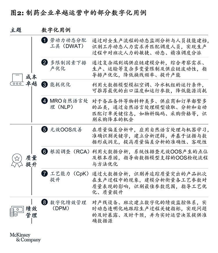 针对大家最关心的数字化用例,我们从全球制药企业灯塔工厂已落地的80多个数字化用例合集中,精选了以下8类对中国制药企业最有借鉴意义的用例,包括劳动力动态分配工具、多限制因素下排产优化、能耗优化、MRO自然语言处理、无效OOS改善、数字化绩效管理等,供企业参考。