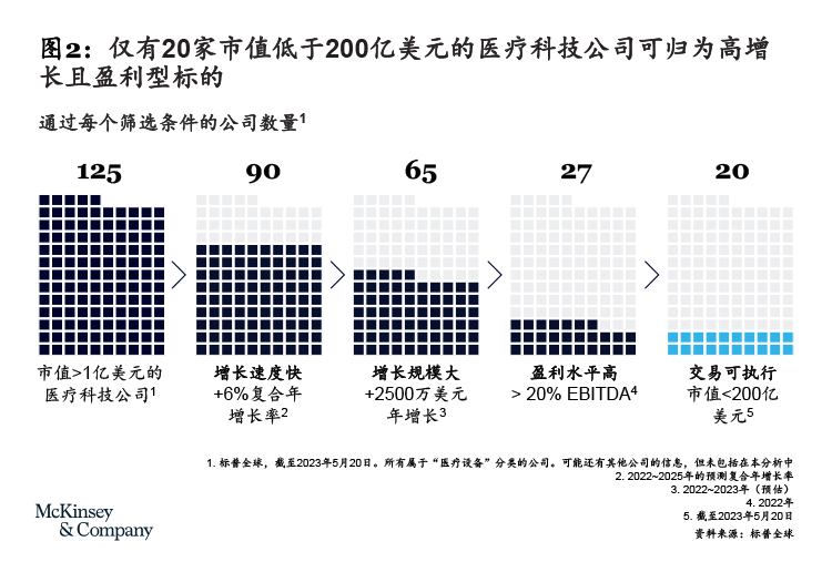 根据麦肯锡对欧美市值前125家医疗科技公司的分析表明,进一步强调盈利能力,让可行标的数量变得更少(见图2)。