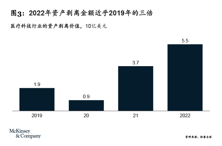 而通过资产剥离,公司可调整其业务组合,为“保留业务”和“剥离业务”的价值轨迹同时按下重设键(被剥离的业务可能在前母公司并未获得足够的资金和关注)。母公司可借此脱离战略价值或财务价值较低的业务单元,让管理层专注于核心业务;同时,被剥离业务也能获得更专注的领导重视和资源,全力聚焦于自身发展。资产剥离所得还可为公司潜在的收购或增长计划提供资金,使公司无需巨额举债。资产剥离活动正日益活跃;从全球看,2022年,医疗科技公司出售的业务(按价值衡量)几乎是2019年的三倍(见图3)。从今年来看,该趋势丝毫没有放缓的迹象:截至2023年5月,在排名前15的医疗科技公司中,已有3家宣布计划剥离营收共计超过90亿美元的业务。