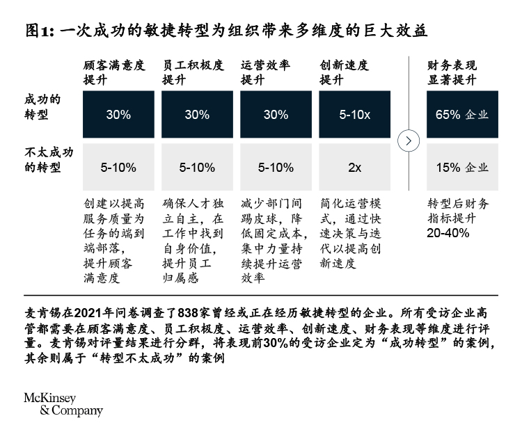 近两年麦肯锡通过对全球2000多家企业的问卷调查,得出一个重要结论:敏捷企业在疫情期间更具韧性并能提升效益。根据我们的测算,韧性较强的企业在顾客满意度、员工积极度、运营效率等方面平均提升了30%,而创新速度则增长5~10倍,其中65%的企业认为敏捷转型会对财务指标产生重大贡献(见图)。但我们也发现,不同机构推动敏捷转型的效益存在巨大差异,仅仅引入容易实施的敏捷实践而没有相应进行组织机制调整,往往难以实现预期成果。