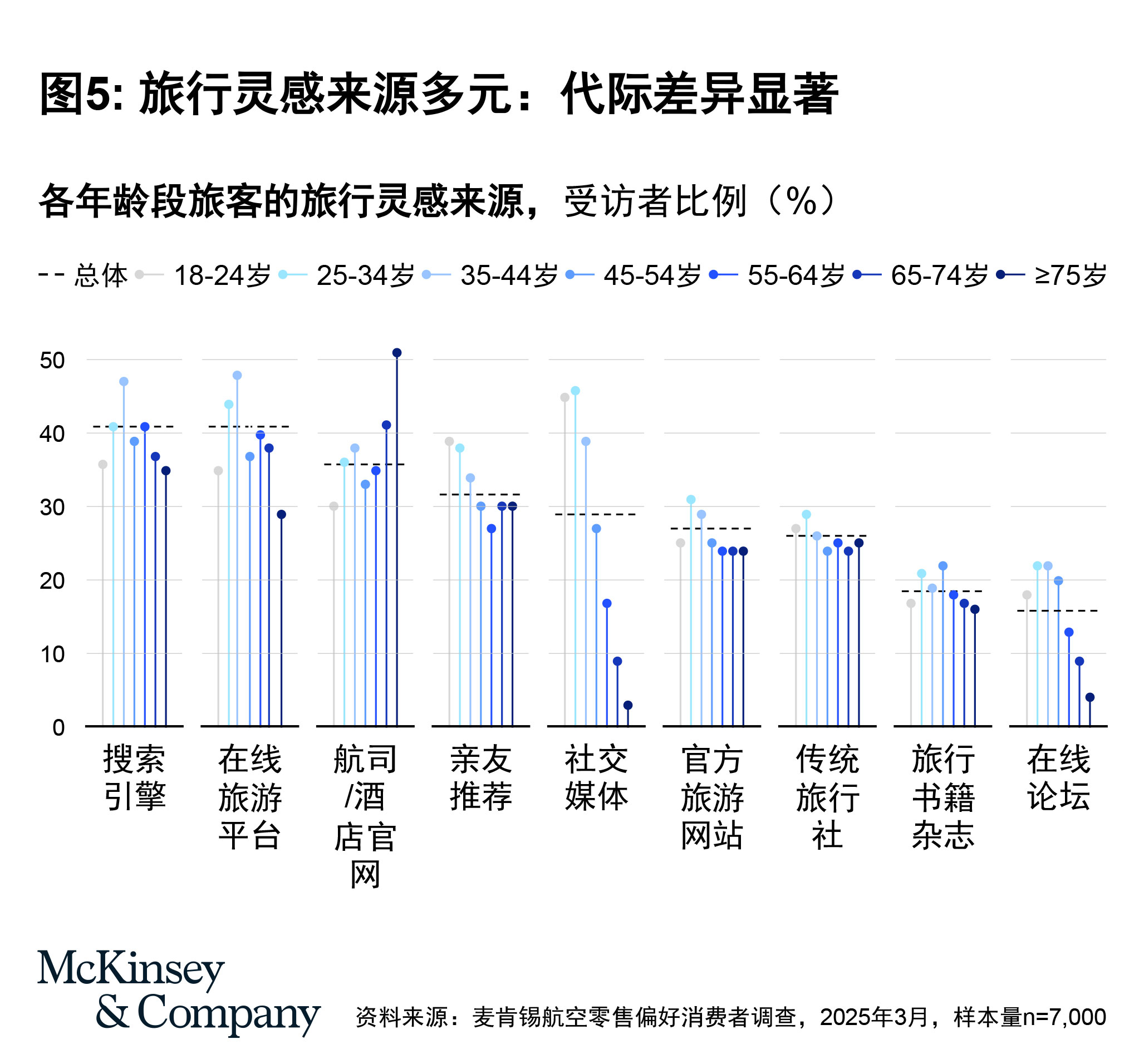 相比之下,航司与酒店官网对年长旅客更具吸引力:在65至74岁群体中,41%从官网获取旅行灵感;而在75岁以上旅客中,这一比例更升至51%。