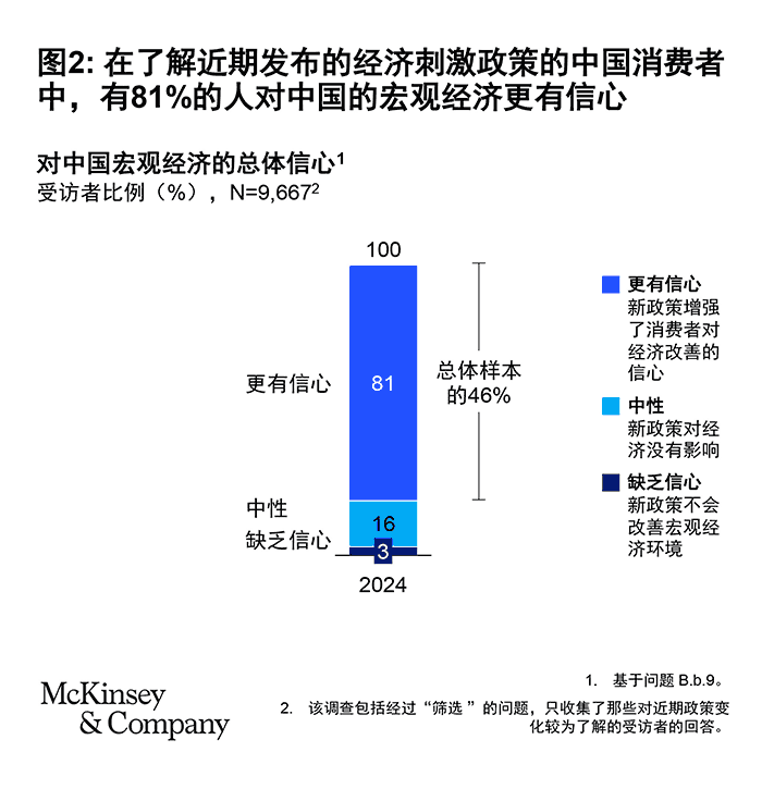自2024年9月起,中国人民银行(PBOC)推出了一系列旨在提振消费者信心的刺激政策。尽管这些政策的全面效果尚待观察,但在近9,700名了解这些政策的受访者中,81%的人表示对中国宏观经济前景更有信心(见图2)。