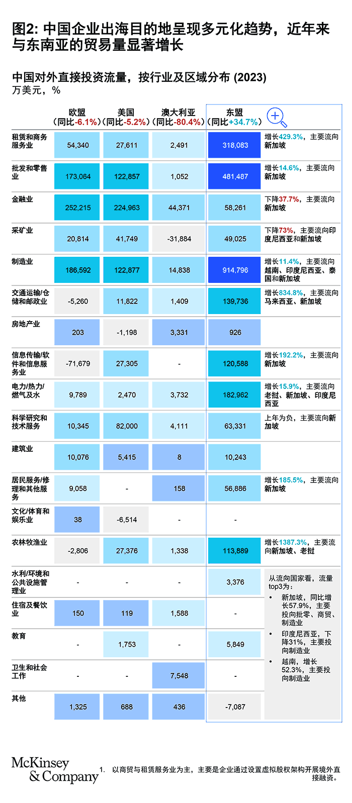 中国进出口贸易量增长率近4%,达到近6万亿美元规模;企业出海目的地呈现多元化趋势,向东盟国家直接投资流量同比增长35%。2014-2023年,中国进出口贸易总量年复合增长率达到3.6%;对外直接总投资年复合增长率达到4.1%。从区域看,2023年我国对外直接投资投向东盟、欧盟、美国、澳大利亚的流量同比分别为+34.7%、-6.1%、-5.2%、-80.4%。东盟地区中,流量前三的国家分别为新加坡、印度尼西亚及越南,且企业的出海目的地因行业而异(见图1、2)。