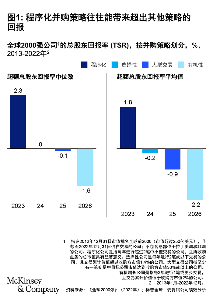 并购交易中并无“万无一失”的成功之道。但对过去几十年成千上万宗交易的研究,让我们得出了一些确凿结论。其中,程序化并购的强大威力尤为凸显。所谓程序化并购,即公司将每年多次进行的中小型收购作为增长战略的一部分。采用程序化交易方式的公司最有可能以相对较低的风险,实现超额总股东回报(TSR)。这一最新发现,源自对全球头部上市公司(我们称之为“全球2000强”)的年度深入分析,以及最新的麦肯锡全球并购能力调查[1],它进一步巩固并拓展了我们二十余年的研究成果。