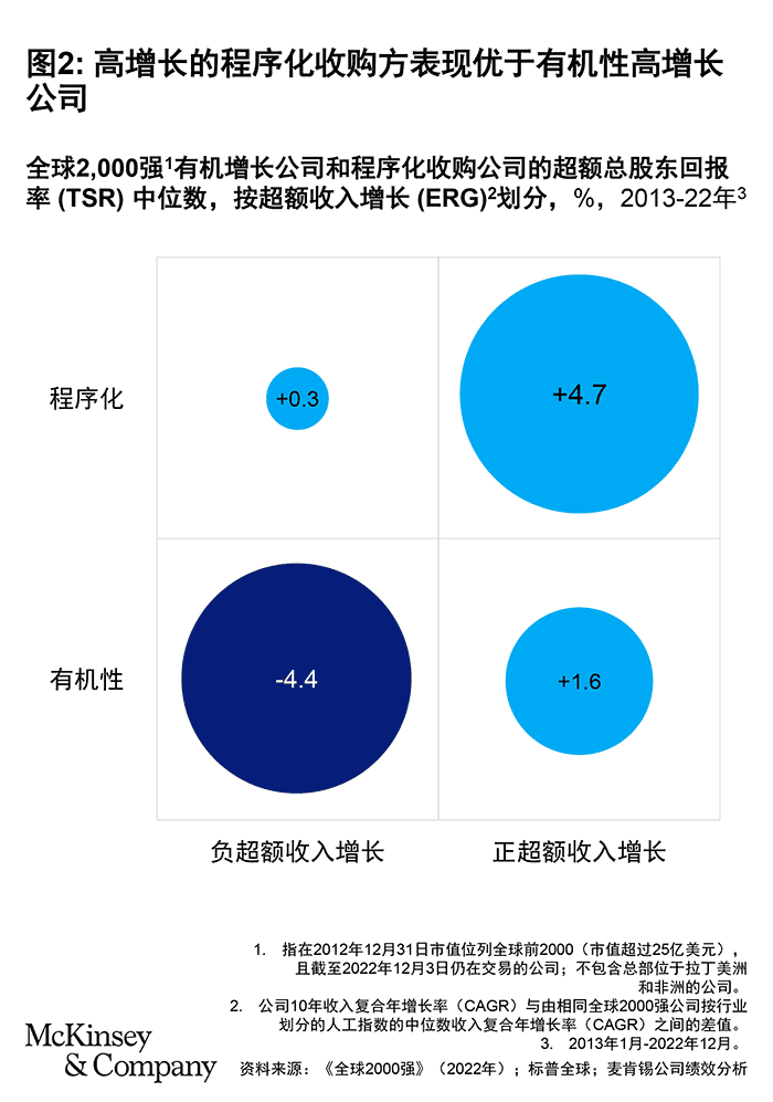 我们的最新调查还聚焦于高增长行业,以检验程序化并购是否依然卓有成效:答案是肯定的。在这些行业,程序化收购方的表现优于那些未将并购提升至战略高度、仅依赖有机增长的高增长公司。
