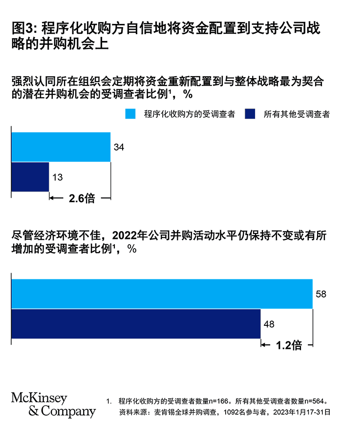 1.加倍贯彻成功战略:程序化收购方会制定清晰的并购蓝图,明确并购的目的与领域,以实现具体的战略目标。但这仅仅是起点。他们还会积极管理投资组合,定期将资本重新配置到契合企业战略的收购项目中。自2021年以来的调查显示,程序化收购方更倾向于采取这些举措,即便在充满不确定性的时期也毫不懈怠。根据我们的经验,最高效的收购者深谙经济周期对并购计划的影响,他们会主动探索各种情景并制定计划,即便在经济低迷时期仍能继续投资。事实上,基于我们的调查,在经济形势严峻的2022年,更多的程序化收购方维持甚至增加了并购活动。