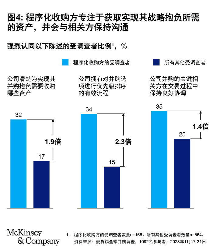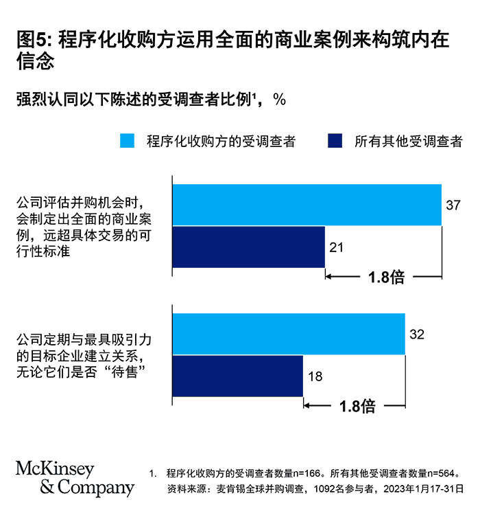 3.构筑坚定的内在信念:在经济困难时期,坚守追求必要并购目标的信念尤为重要且极具挑战。调查结果显示,无论经济状况如何,程序化收购方都更倾向于主动寻找交易机会,为核心领导团队和董事会提供源源不断的选择,助力并购战略的有效执行。此外,他们更有可能制定全面的商业案例,远超具体交易的可行性标准。这些商业案例是高管和董事会就拟议交易达成共识的重要工具,有助于加速决策进程。