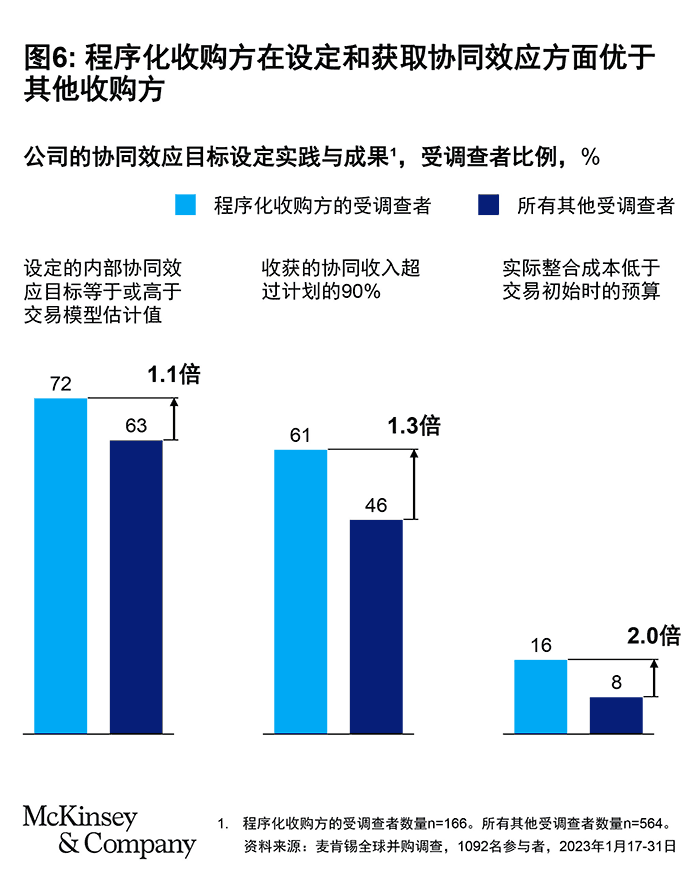 4.充分发挥交易潜力:研究表明,程序化收购方,一方面能够积极应对颠覆性因素对核心业务和收购目标带来的影响;另一方面,还能积极实现交易的全部价值潜力。相比其他公司,他们更有可能设定等于或高于尽职调查预估值的内部协同目标(收入、成本和资本),并仔细制定预算,追踪实现交易协同效应所需的成本,通常为一次性成本。事实上,根据调查,程序化收购方实际整合成本比初始预算低至少20%的可能性,而能做到这一点的程序化收购方数量是普通公司的两倍。根据我们的经验,拥有明确负责人对于充分释放交易潜力至关重要。这种责任与财务纪律应贯穿并购的各个阶段,从构思到执行。