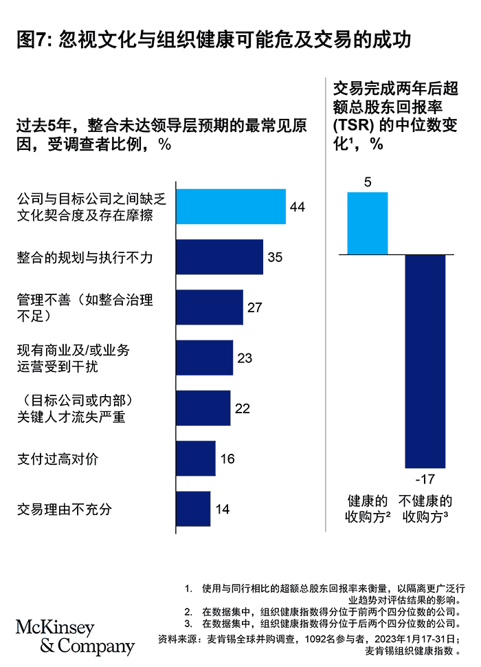 5.以健康文化为基石:文化常常是成功交易中被忽视的因素。基于调查,收购方与目标公司之间的文化不契合和摩擦,是整合未达预期的最常见原因。根据我们的经验,文化往往是财务表现的重要驱动因素。相关研究还发现,健康企业进行大宗收购时的表现往往更好。具体而言,拥有健康文化的企业(即组织健康指数处于前两个四分位的企业)在进行大宗收购后的超额TSR提升了5%,而拥有不健康文化的企业(即组织健康指数处于后两个四分位的企业)的超额TSR下降了17%(以交易完成两年后的中位数超额TSR衡量)。