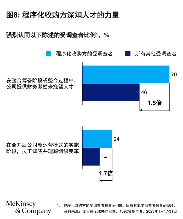 6.珍视人才价值,做好风险预案:并购目标公司的人才,往往是并购成功的关键。领导者在整合过程中,需充分考虑目标公司和自身公司优秀员工的高离职风险。尽早锁定关键角色和人员(通常在尽职调查期间),是缓解风险的关键步骤。研究表明,程序化收购方更有可能提供财务激励来挽留员工,但这并非唯一举措。非财务认可和文化因素,如高层领导的私下沟通、量身定制的职业发展计划(明确晋升潜力),往往对于留住员工同样重要,甚至更为有效。