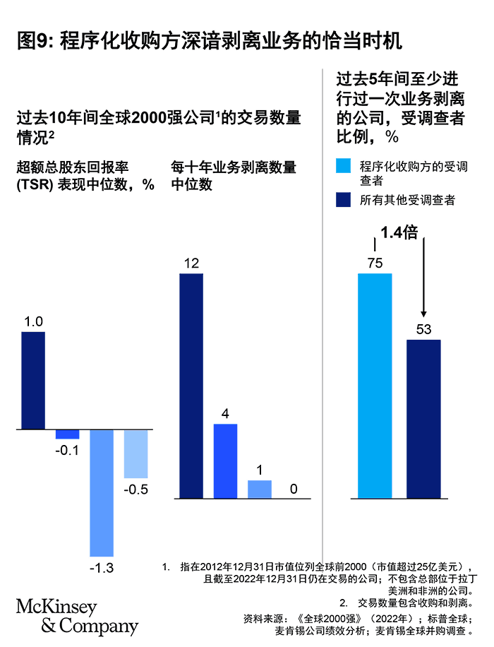7.秉持最佳所有者心态:程序化收购方深刻理解收购战略的另一面:明确哪些是非战略性资产,应适时剥离。调查显示,他们在过去5年进行资产剥离的比例更高。对全球2000强公司的研究表明,交易活跃(包括收购和剥离)的公司拥有更高的超额TSR。通过资产剥离,管理层能够聚焦于已有的战略“核心”业务,以及未来可能的收购方向。