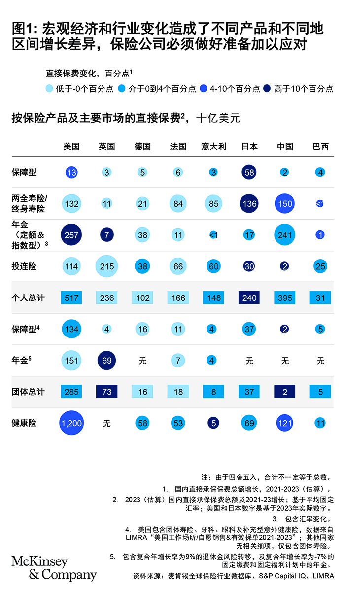 2023年宏观经济和寿险行业的变化,导致了不同寿险产品以及不同地区间的增长分化。但整体来看,传统寿险产品和主要国家市场大多处于停滞状态,整个寿险行业正在寻求新的增长点(见图表1)。