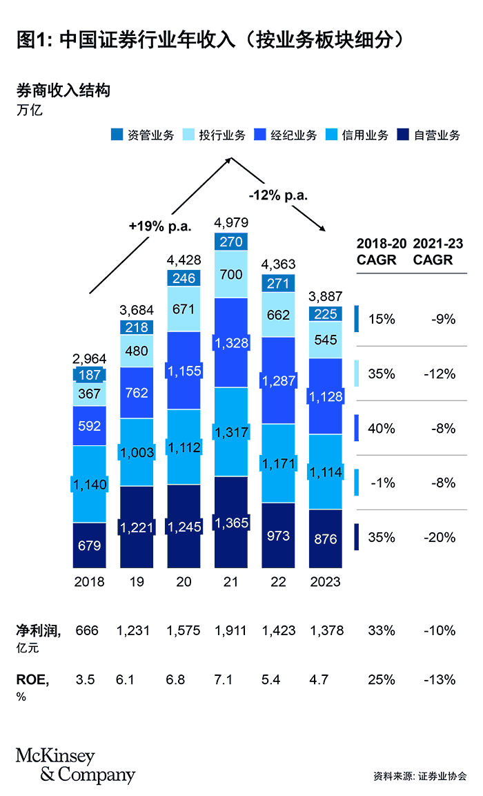 经过2018至2021年的快速增长,中国证券行业近年来营业收入、净资产收益率和净利润均显示出下降趋势(见图1)。在经营环境变化和市场波动的双重影响下,行业各业务板块均面临不同程度的挑战。头部券商增长稳定性及中小券商生存压力成为行业普遍挑战。与此同时,业务模式转型启动,行业整合拉开帷幕,出海需求方兴未艾,这三大趋势又给中国证券公司带来新发展机遇。