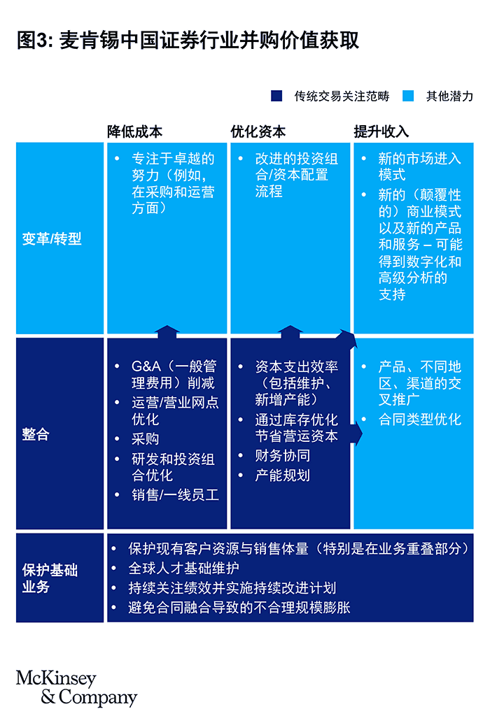 三是整合价值的战略性。这一轮整合不仅能够给券商在降低成本、优化资本等传统并购交易关注的范畴带来价值,更需要成为业务转型变革的“触发器”,从而在业务规模合并的基础上实现“1+1>2”的收入利润增长。