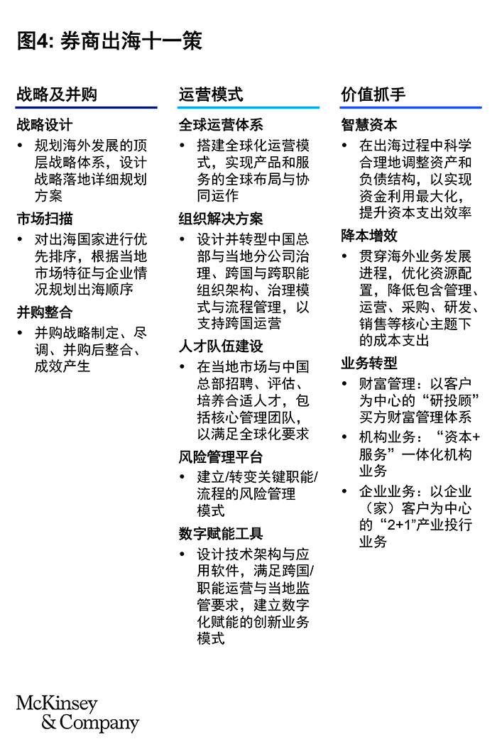 为更好帮助中资券商规划并实施海外发展这一重要战略,我们提炼出“券商出海十一策”,为中资券商提供成熟的出海战略参考: