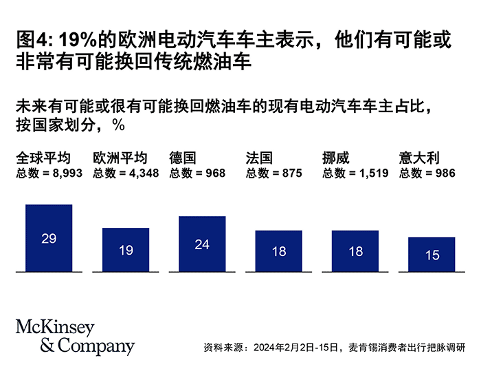 虽然汽车电动化的前景总体是光明的,但根据我们的调研,有19%的欧洲电动车主表示,鉴于当前体验,他们“有可能”或“很有可能”在购买下一台车时回归传统燃油车(见图4)。我们有必要结合更宏观的视角来审视该数字——调研显示,全球范围内有29%的电动车主表示“很有可能”在下次购车时换回燃油车,因此欧洲地区作此选择的车主比例实际上低于其他地区。