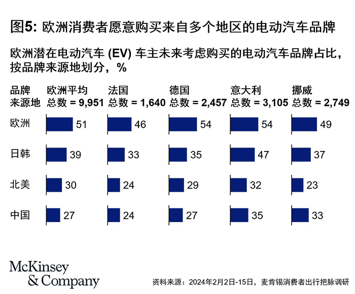 消费者购买新兴品牌的意愿因国家和细分市场而异(见图5)。例如,在高端品牌市场,考虑购买电动汽车的受访者中有33%的人表示未来愿意购买中国品牌。但是,鉴于欧盟最近决定对从中国进口的电动汽车征收关税,这类新兴品牌在欧洲能取得多大成功,仍然是个未知数。