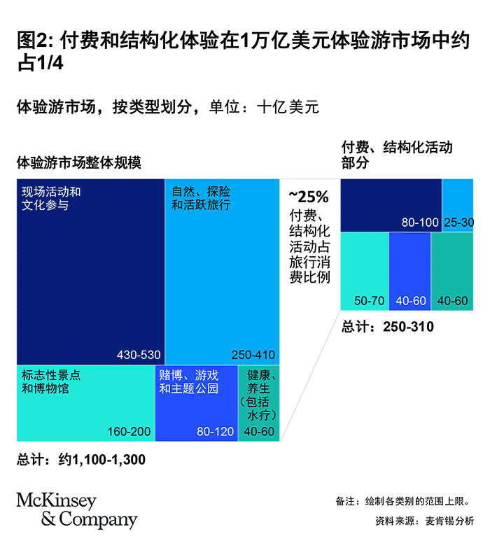 许多当地居民也参与了目的地的体验类产品消费。但根据我们的调研,外来游客(包括本地和国际游客)约占体验游市场的30%,他们的体验类消费约为1.1万亿至1.3万亿美元,我们将其定义为体验游的总有效市场。