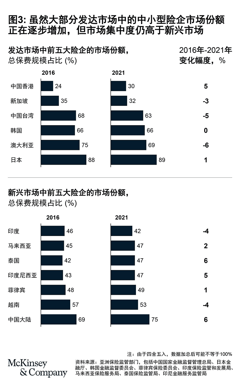大型险企之间的整合:在发达市场和发展中市场,市场整合度表现出显著差异(见图3)。大多数发达市场仍主要被本地大型险企占据。不过,跨国公司在马来西亚和印度等新兴市场表现不俗,前五大国际险企在这些市场的占有率已达30%至40%。然而,亚洲财险业的跨国公司参与度仍显不足。作为对比,跨国企业在寿险行业中的总保费中占比平均达到14%。