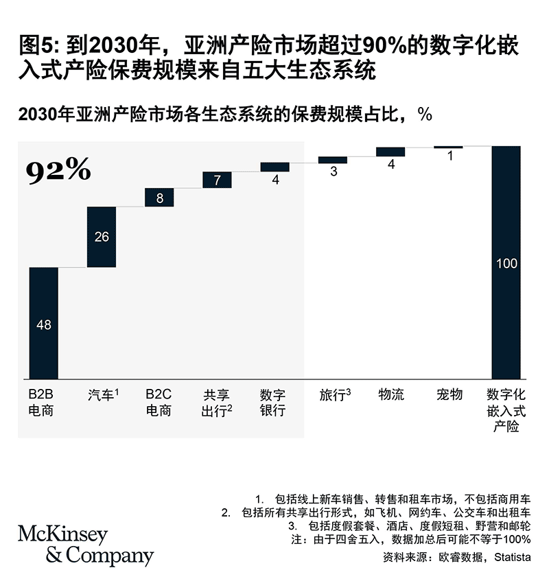 亚洲财险公司有机会从嵌入式保险中获取更多价值,在电子商务(B2B和B2C)、车辆、共享出行和银行业等关键生态系统尤其可以大有作为。预计到2030年,这些生态系统将为数字嵌入式财险贡献 90%以上的总保费(见图5)。除这些用户群外,保险公司还可以挖掘与数字生态系统中其他潜在合作伙伴的机会,以最大化实现与数字生态系统合作的价值。