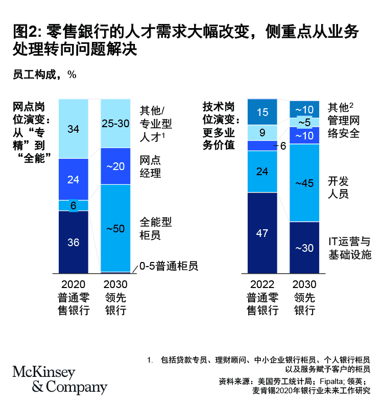 未来3-5年,对新技能的需求将是供给的2-4倍。银行从业人员的技能结构需要发生巨大转变,从关注任务处理转向问题解决。例如,网点工作人员的主要角色从传统柜员转向全能型柜员。与之类似,银行开发人员与技术运营、基础设施专员的比例也会从1:2变为1.5:1。对银行而言,帮助内部员工实现技能重塑的成本效益比外聘新人高20%~30%。银行也需要采用新的人才招聘与留用模式。例如,领先银行在招募开发人员时,不仅着眼于薪酬与激励,还通过为开发人员打造卓越工作环境,例如简化代码部署到生产环境的审批流程和人工测试,增强对高端人才的吸引力(见图2)。