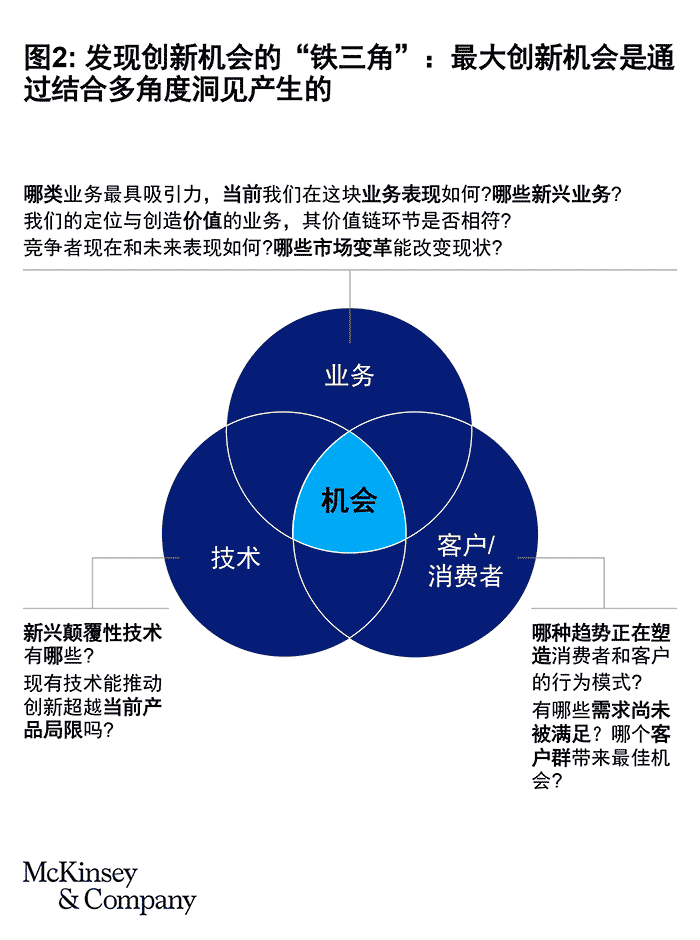 通过创新“铁三角”,采用系统化方法完善需求挖掘,结合技术、客户、业务三个方面的洞见发现创新机会,并对创新项目的预期价值、时机以及风险进行持续评估(图2)。