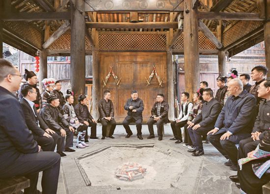 2025年3月17日至18日,中共中央总书记、国家主席、中央军委主席习近平在贵州考察。这是17日下午,习近平在黔东南州黎平县肇兴侗寨考察时,在信团鼓楼同村干部和村民代表围坐在火塘边,共话乡村全面振兴。 新华社记者 谢环驰/摄