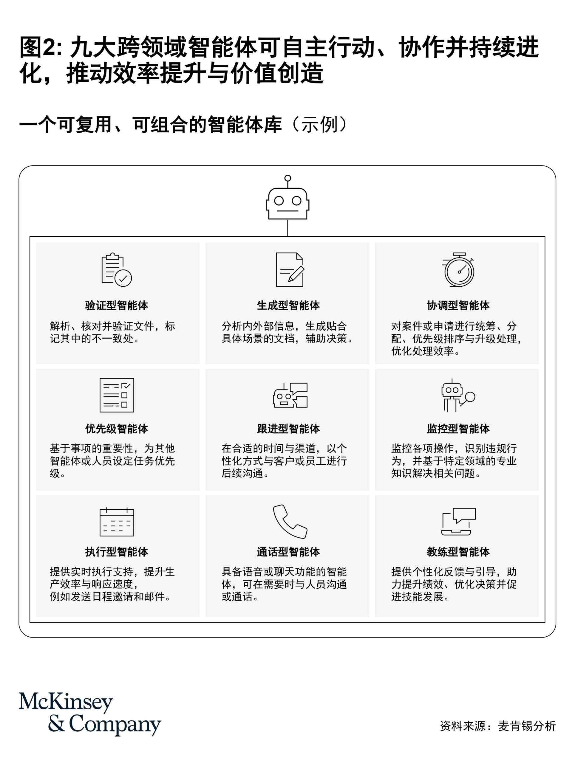 麦肯锡识别出九类可跨领域应用的智能体。在“人类在环”编排机制下,它们能够在上述十大运营领域中保障合规、提升透明度并增强组织韧性。这些智能体兼具行动、决策、协调、沟通以及持续学习优化的能力。